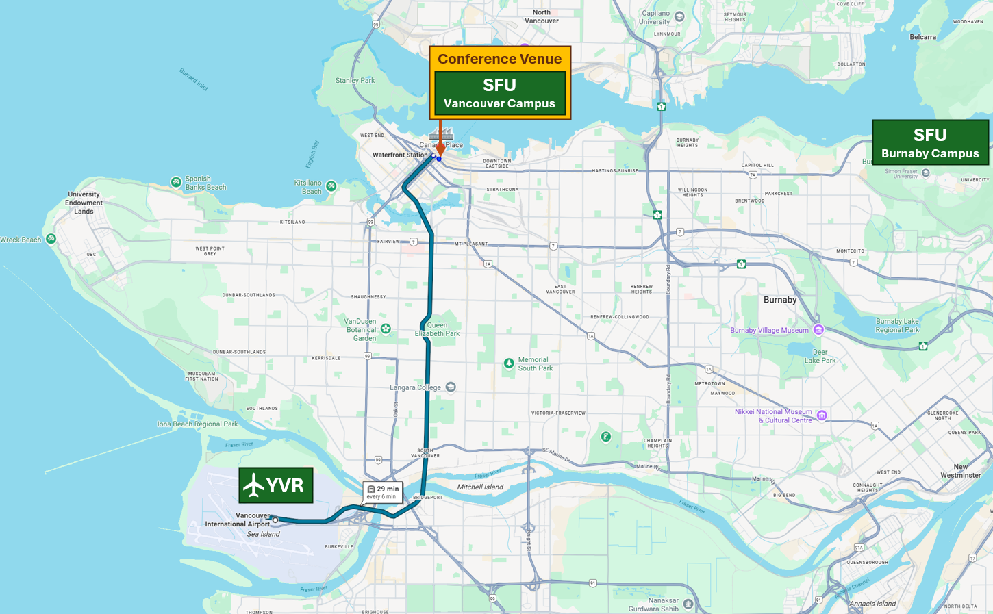The conference is at the SFU, Vancouver Campus, around 30 minutes from the airport.